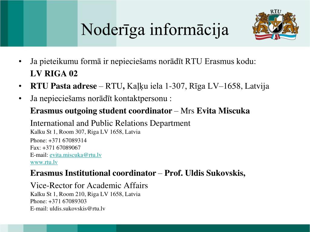 Noderīga informācija • Ja pieteikumu formā ir nepieciešams norādīt RTU Erasmus kodu: LV RIGA 02 • RTU Pasta adrese – RTU, Kaļķu iela 1-307, Rīga LV–1658, Latvija • Ja nepieciešams norādīt kontaktpersonu : Erasmus outgoing student coordinator – Mrs Evita Miscuka International and Public Relations DepartmentKalku St 1, Room 307, Riga LV 1658, Latvia Phone: +371 67089314Fax: +371 67089067E-mail: evita.miscuka@rtu.lvwww.rtu.lv Erasmus Institutional coordinator – Prof. Uldis Sukovskis, Vice-Rector for Academic Affairs Kalku St 1, Room 210, Riga LV 1658, Latvia Phone: +371 67089303E-mail: uldis.sukovskis@rtu.lv