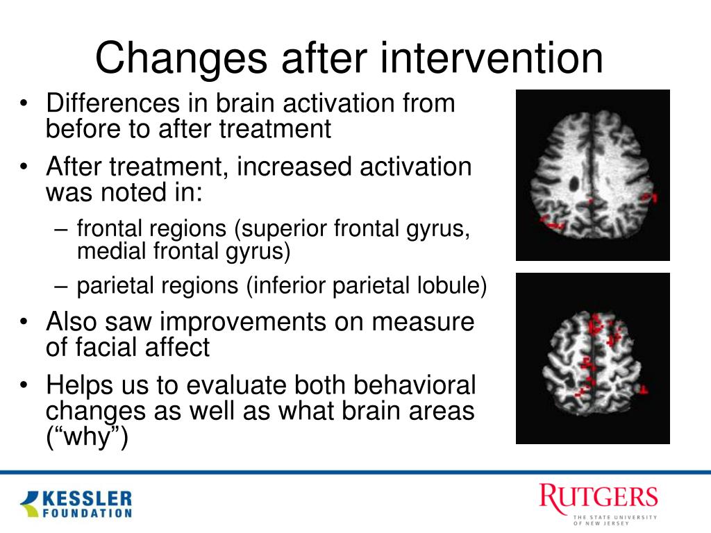 Changes after intervention • Differences in brain activation from before to after treatment • After treatment, increased activation was noted in: • frontal regions (superior frontal gyrus, medial frontal gyrus) • parietal regions (inferior parietal lobule) • Also saw improvements on measure of facial affect • Helps us to evaluate both behavioral changes as well as what brain areas (“why”)