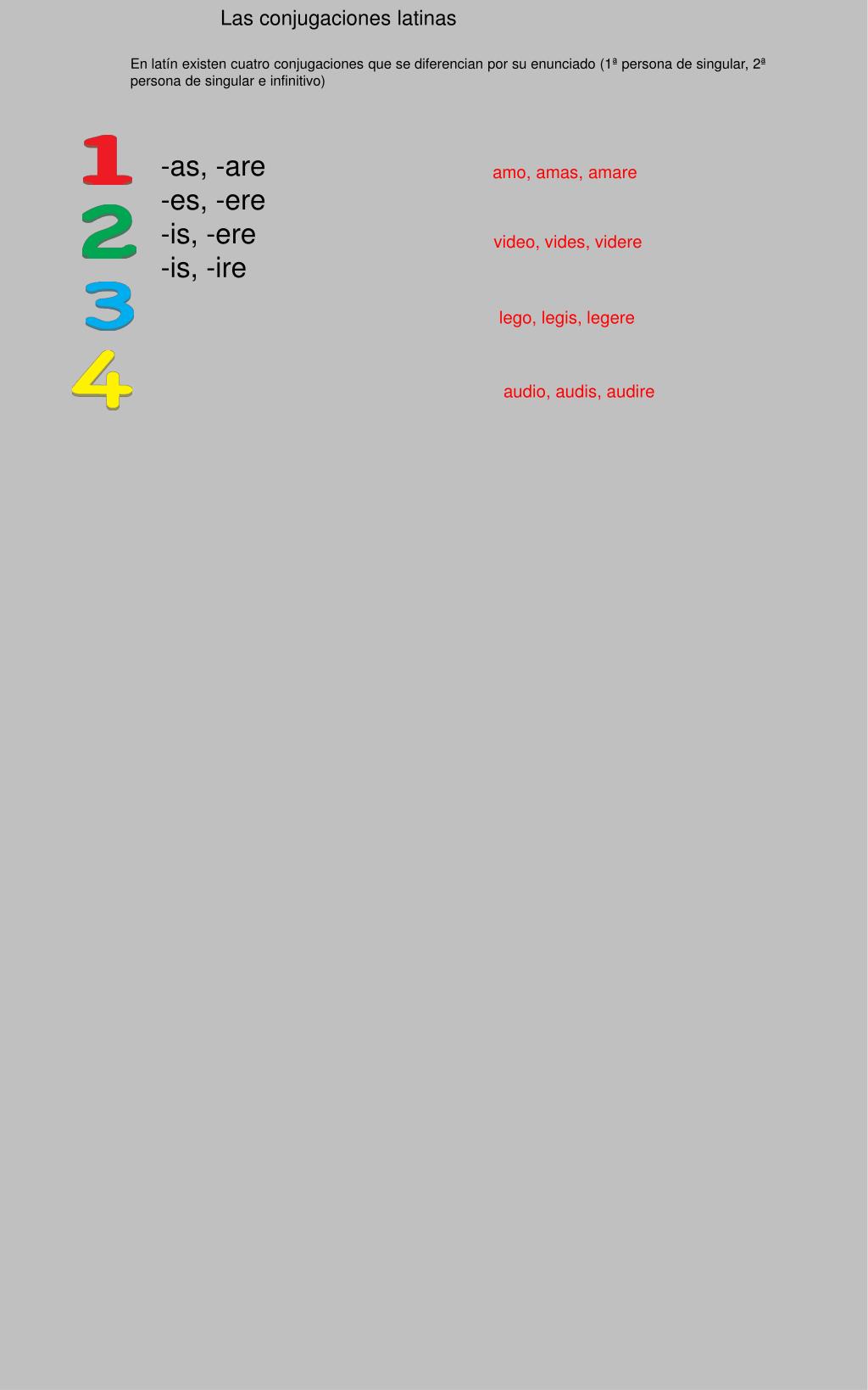 Las conjugaciones latinas. En latín existen cuatro conjugaciones que se diferencian por su enunciado (1ª persona de singular, 2ª persona de singular e infinitivo). -as, -are -es, -ere -is, -ere -is, -ire. amo, amas, amare. video, vides, videre. lego, legis, legere. audio, audis, audire.