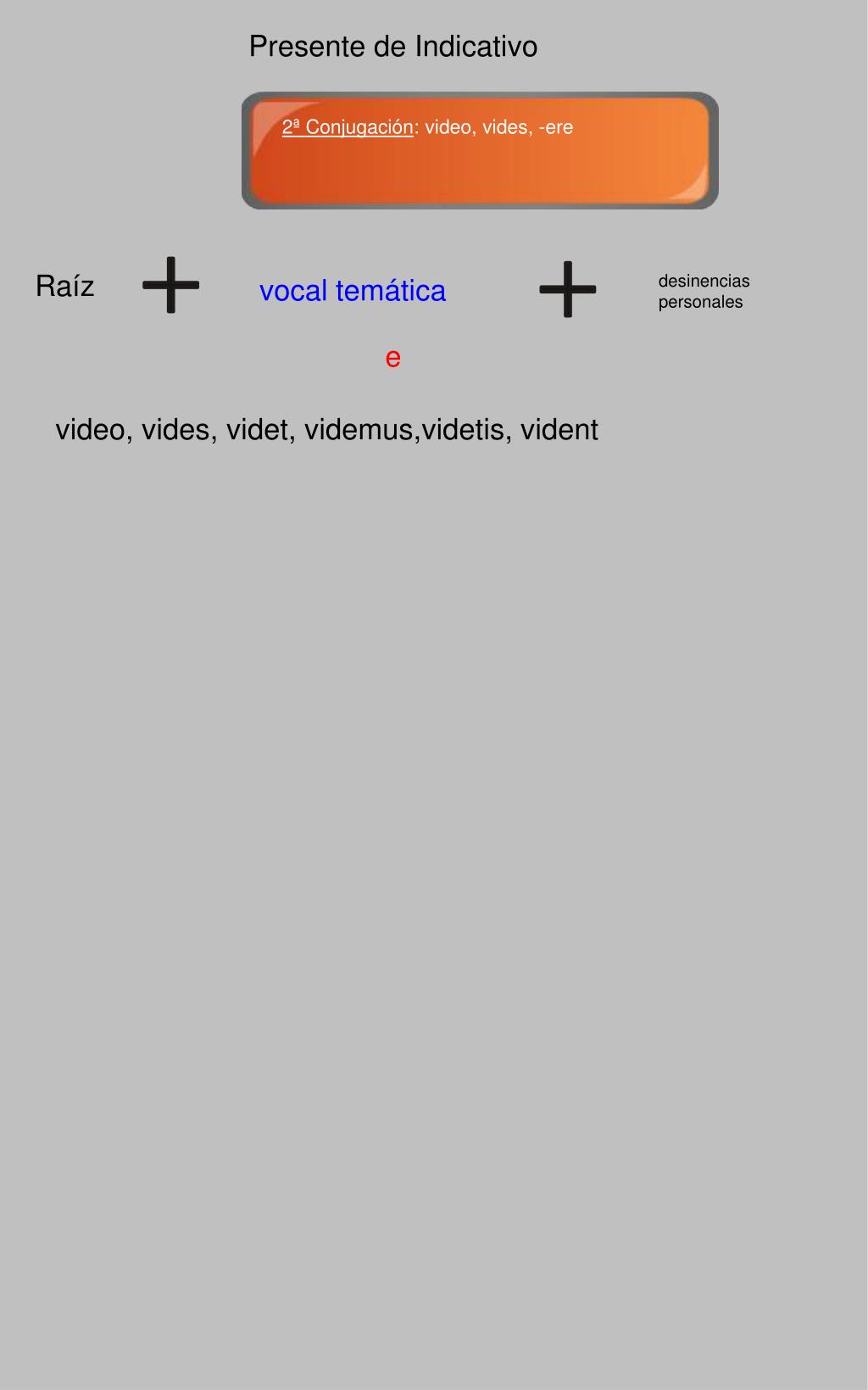Presente de Indicativo 2ª Conjugación: video, vides, -ere Raíz desinencias personales vocal temática e video, vides, videt, videmus,videtis, vident