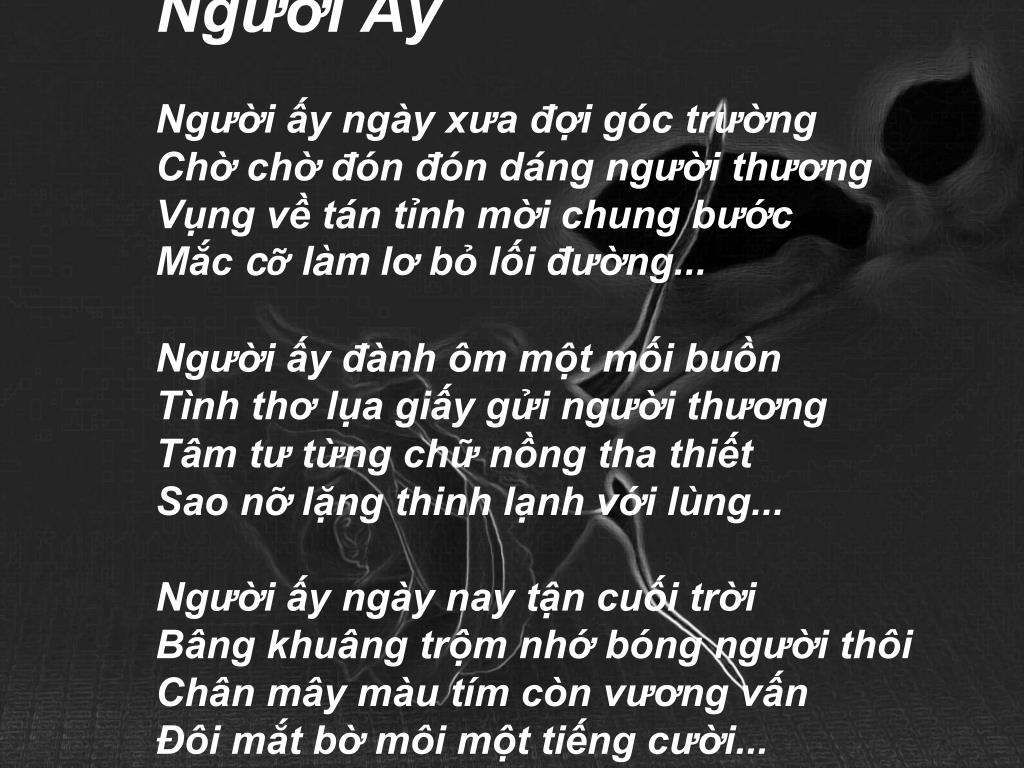 Người Ấy Người ấy ngày xưa đợi góc trường Chờ chờ đón đón dáng người thương Vụng về tán tỉnh mời chung bước Mắc cỡ làm lơ bỏ lối đường... Người ấy đành ôm một mối buồn Tình thơ lụa giấy gửi người thương Tâm tư từng chữ nồng tha thiết Sao nỡ lặng thinh lạnh với lùng... Người ấy ngày nay tận cuối trời Bâng khuâng trộm nhớ bóng người thôi Chân mây màu tím còn vương vấn Đôi mắt bờ môi một tiếng cười...