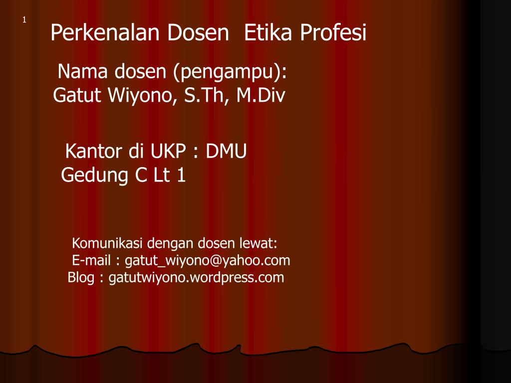 1 Perkenalan Dosen Etika Profesi Nama dosen (pengampu): Gatut Wiyono, S.Th, M.Div Kantor di UKP : DMU Gedung C Lt 1 Komunikasi dengan dosen lewat: E-mail : gatut_wiyono@yahoo.com Blog : gatutwiyono.wordpress.com