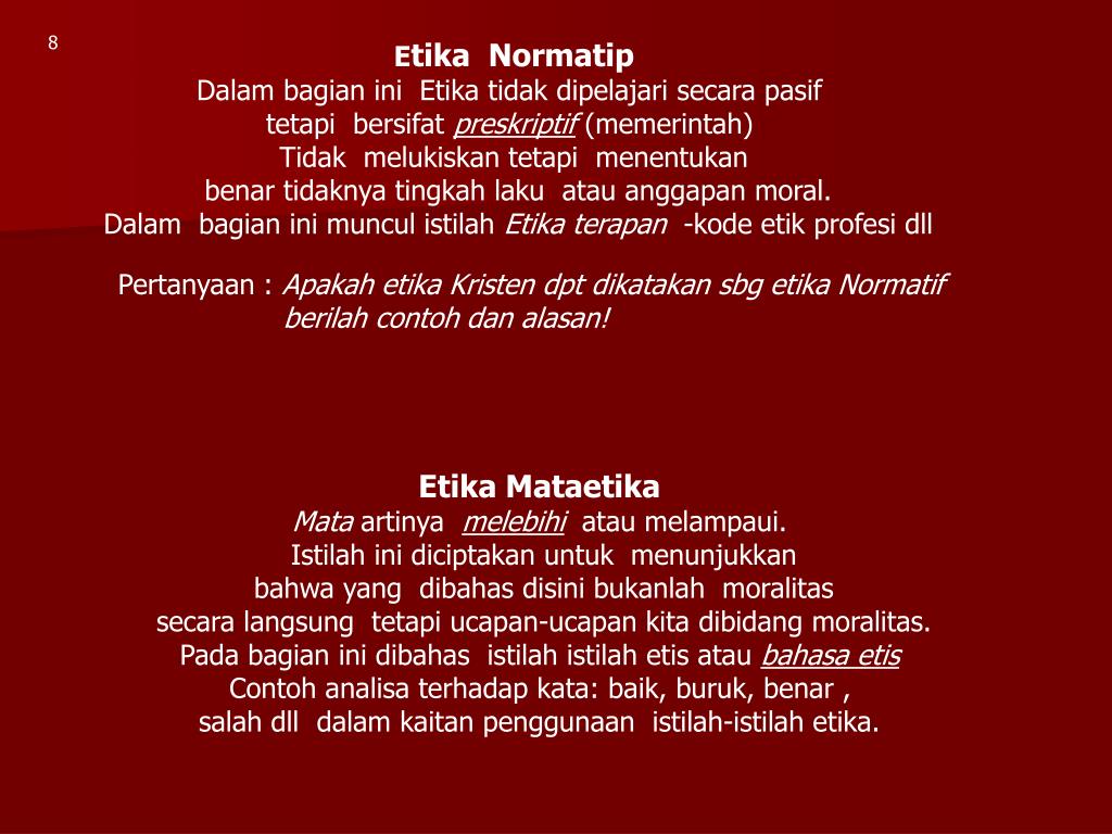 8 Etika Normatip Dalam bagian ini Etika tidak dipelajari secara pasif tetapi bersifat preskriptif (memerintah) Tidak melukiskan tetapi menentukan benar tidaknya tingkah laku atau anggapan moral. Dalam bagian ini muncul istilah Etika terapan -kode etik profesi dll Pertanyaan : Apakah etika Kristen dpt dikatakan sbg etika Normatif berilah contoh dan alasan! Etika Mataetika Mata artinya melebihi atau melampaui. Istilah ini diciptakan untuk menunjukkan bahwa yang dibahas disini bukanlah moralitas secara langsung tetapi ucapan-ucapan kita dibidang moralitas. Pada bagian ini dibahas istilah istilah etis atau bahasa etis Contoh analisa terhadap kata: baik, buruk, benar , salah dll dalam kaitan penggunaan istilah-istilah etika.