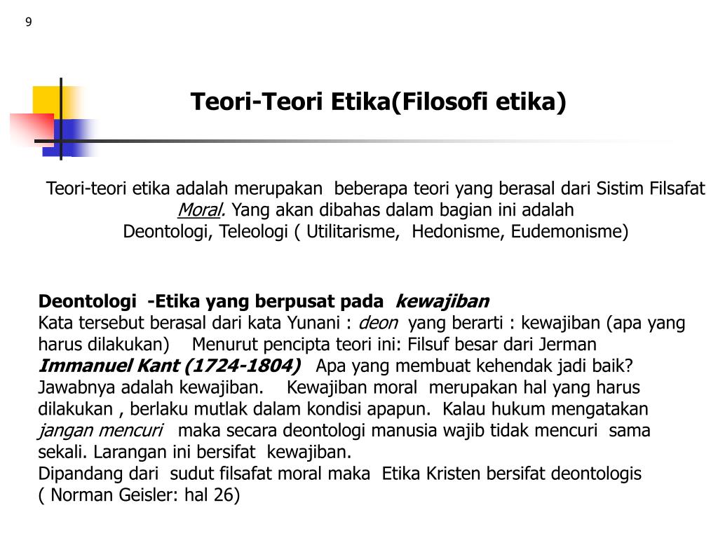 9 Teori-Teori Etika(Filosofi etika) Teori-teori etika adalah merupakan beberapa teori yang berasal dari Sistim Filsafat Moral. Yang akan dibahas dalam bagian ini adalah Deontologi, Teleologi ( Utilitarisme, Hedonisme, Eudemonisme) Deontologi -Etika yang berpusat pada kewajiban Kata tersebut berasal dari kata Yunani : deon yang berarti : kewajiban (apa yang harus dilakukan) Menurut pencipta teori ini: Filsuf besar dari Jerman Immanuel Kant (1724-1804) Apa yang membuat kehendak jadi baik? Jawabnya adalah kewajiban. Kewajiban moral merupakan hal yang harus dilakukan , berlaku mutlak dalam kondisi apapun. Kalau hukum mengatakan jangan mencuri maka secara deontologi manusia wajib tidak mencuri sama sekali. Larangan ini bersifat kewajiban. Dipandang dari sudut filsafat moral maka Etika Kristen bersifat deontologis ( Norman Geisler: hal 26)