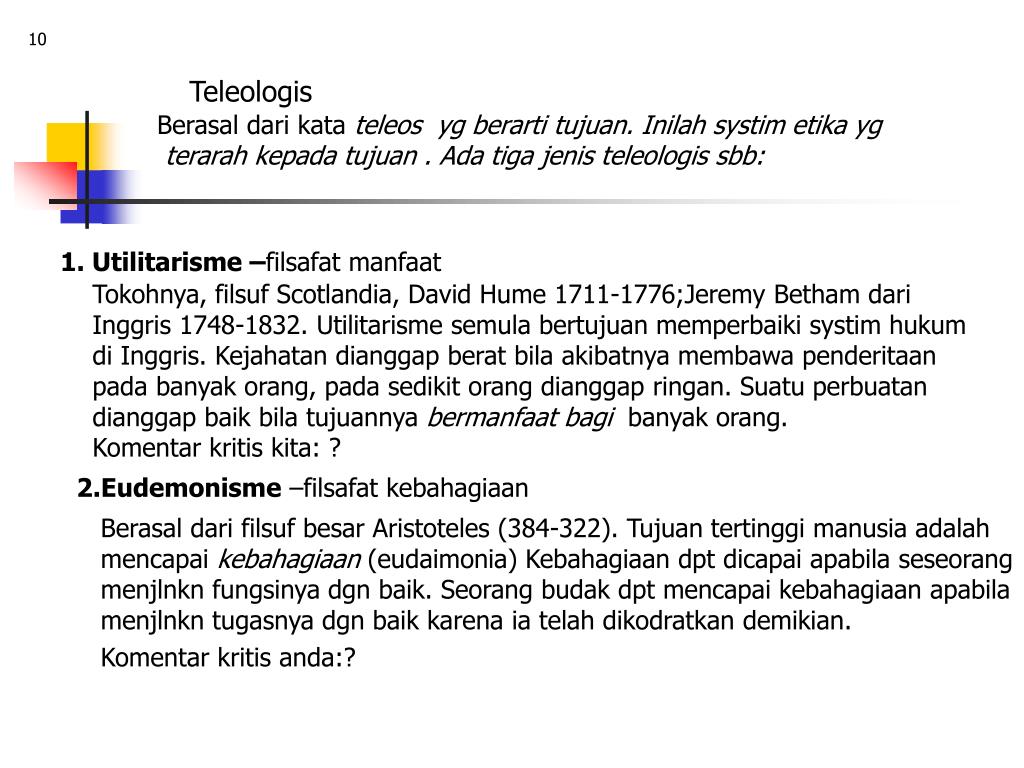 10 Teleologis Berasal dari kata teleos yg berarti tujuan. Inilah systim etika yg terarah kepada tujuan . Ada tiga jenis teleologis sbb: 1. Utilitarisme –filsafat manfaat Tokohnya, filsuf Scotlandia, David Hume 1711-1776;Jeremy Betham dari Inggris 1748-1832. Utilitarisme semula bertujuan memperbaiki systim hukum di Inggris. Kejahatan dianggap berat bila akibatnya membawa penderitaan pada banyak orang, pada sedikit orang dianggap ringan. Suatu perbuatan dianggap baik bila tujuannya bermanfaat bagi banyak orang. Komentar kritis kita: ? 2.Eudemonisme –filsafat kebahagiaan Berasal dari filsuf besar Aristoteles (384-322). Tujuan tertinggi manusia adalah mencapai kebahagiaan (eudaimonia) Kebahagiaan dpt dicapai apabila seseorang menjlnkn fungsinya dgn baik. Seorang budak dpt mencapai kebahagiaan apabila menjlnkn tugasnya dgn baik karena ia telah dikodratkan demikian. Komentar kritis anda:?