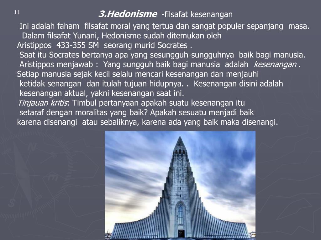 3.Hedonisme -filsafat kesenangan 11 Ini adalah faham filsafat moral yang tertua dan sangat populer sepanjang masa. Dalam filsafat Yunani, Hedonisme sudah ditemukan oleh Aristippos 433-355 SM seorang murid Socrates . Saat itu Socrates bertanya apa yang sesungguh-sungguhnya baik bagi manusia. Aristippos menjawab : Yang sungguh baik bagi manusia adalah kesenangan . Setiap manusia sejak kecil selalu mencari kesenangan dan menjauhi ketidak senangan dan itulah tujuan hidupnya. . Kesenangan disini adalah kesenangan aktual, yakni kesenangan saat ini. Tinjauan kritis: Timbul pertanyaan apakah suatu kesenangan itu setaraf dengan moralitas yang baik? Apakah sesuatu menjadi baik karena disenangi atau sebaliknya, karena ada yang baik maka disenangi.