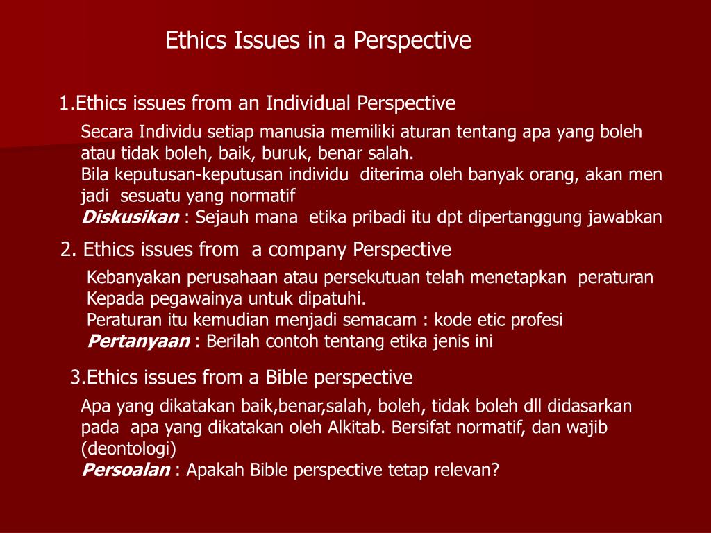 Ethics Issues in a Perspective 1.Ethics issues from an Individual Perspective Secara Individu setiap manusia memiliki aturan tentang apa yang boleh atau tidak boleh, baik, buruk, benar salah. Bila keputusan-keputusan individu diterima oleh banyak orang, akan men jadi sesuatu yang normatif Diskusikan : Sejauh mana etika pribadi itu dpt dipertanggung jawabkan 2. Ethics issues from a company Perspective Kebanyakan perusahaan atau persekutuan telah menetapkan peraturan Kepada pegawainya untuk dipatuhi. Peraturan itu kemudian menjadi semacam : kode etic profesi Pertanyaan : Berilah contoh tentang etika jenis ini 3.Ethics issues from a Bible perspective Apa yang dikatakan baik,benar,salah, boleh, tidak boleh dll didasarkan pada apa yang dikatakan oleh Alkitab. Bersifat normatif, dan wajib (deontologi) Persoalan : Apakah Bible perspective tetap relevan?