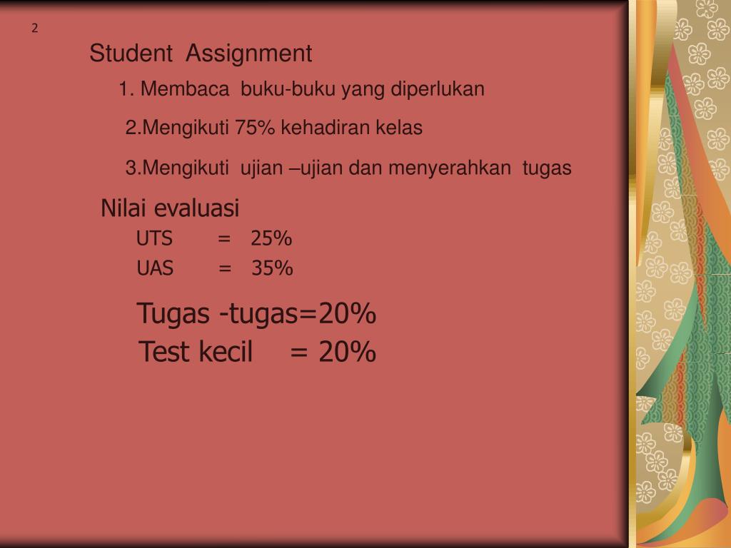 2 Student Assignment 1. Membaca buku-buku yang diperlukan 2.Mengikuti 75% kehadiran kelas 3.Mengikuti ujian –ujian dan menyerahkan tugas Nilai evaluasi UTS = 25% UAS = 35% Tugas -tugas=20% Test kecil = 20%