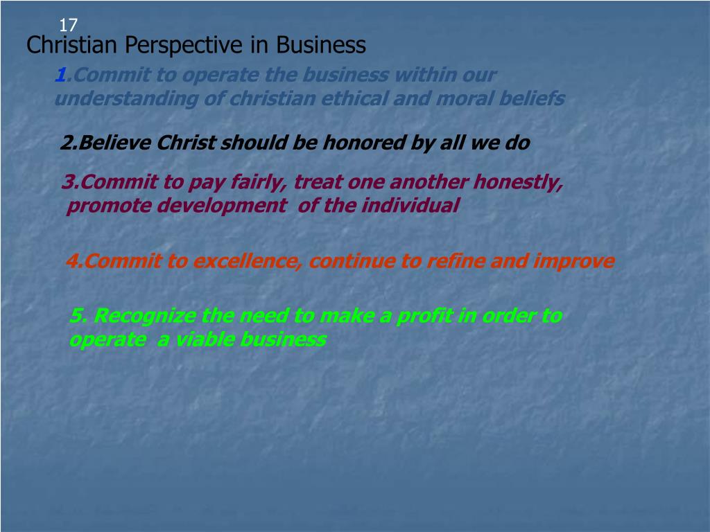 17 Christian Perspective in Business 1.Commit to operate the business within our understanding of christian ethical and moral beliefs 2.Believe Christ should be honored by all we do 3.Commit to pay fairly, treat one another honestly, promote development of the individual 4.Commit to excellence, continue to refine and improve 5. Recognize the need to make a profit in order to operate a viable business