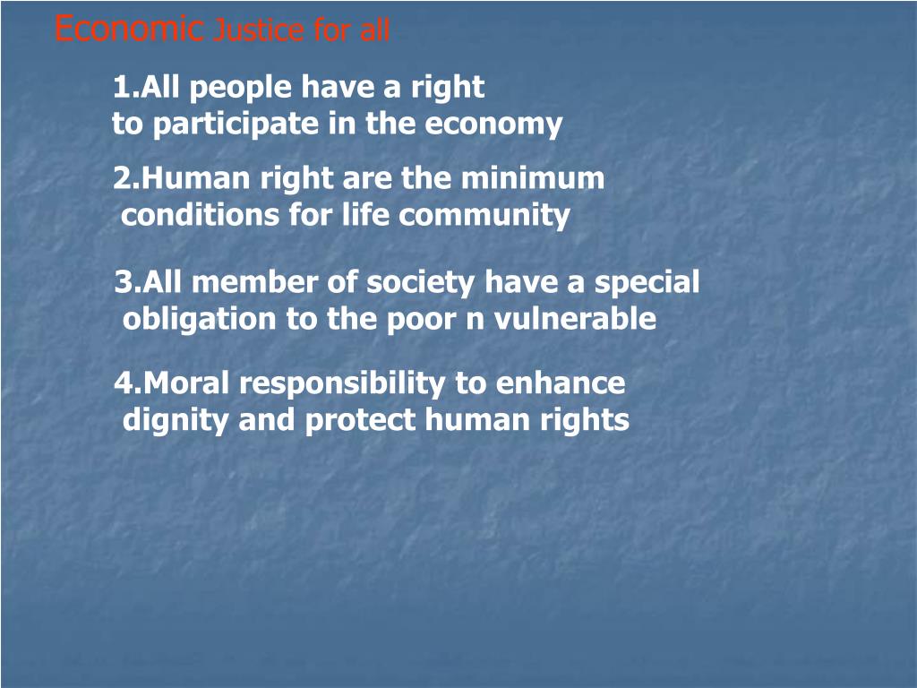 Economic Justice for all 1.All people have a right to participate in the economy 2.Human right are the minimum conditions for life community 3.All member of society have a special obligation to the poor n vulnerable 4.Moral responsibility to enhance dignity and protect human rights
