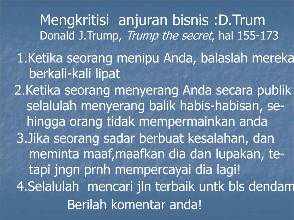 Mengkritisi anjuran bisnis :D.Trum Donald J.Trump, Trump the secret, hal 155-173 1.Ketika seorang menipu Anda, balaslah mereka berkali-kali lipat 2.Ketika seorang menyerang Anda secara publik selalulah menyerang balik habis-habisan, se- hingga orang tidak mempermainkan anda 3.Jika seorang sadar berbuat kesalahan, dan meminta maaf,maafkan dia dan lupakan, te- tapi jngn prnh mempercayai dia lagi! 4.Selalulah mencari jln terbaik untk bls dendam Berilah komentar anda!