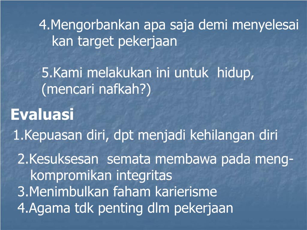 4.Mengorbankan apa saja demi menyelesai kan target pekerjaan 5.Kami melakukan ini untuk hidup, (mencari nafkah?) Evaluasi 1.Kepuasan diri, dpt menjadi kehilangan diri 2.Kesuksesan semata membawa pada meng- kompromikan integritas 3.Menimbulkan faham karierisme 4.Agama tdk penting dlm pekerjaan