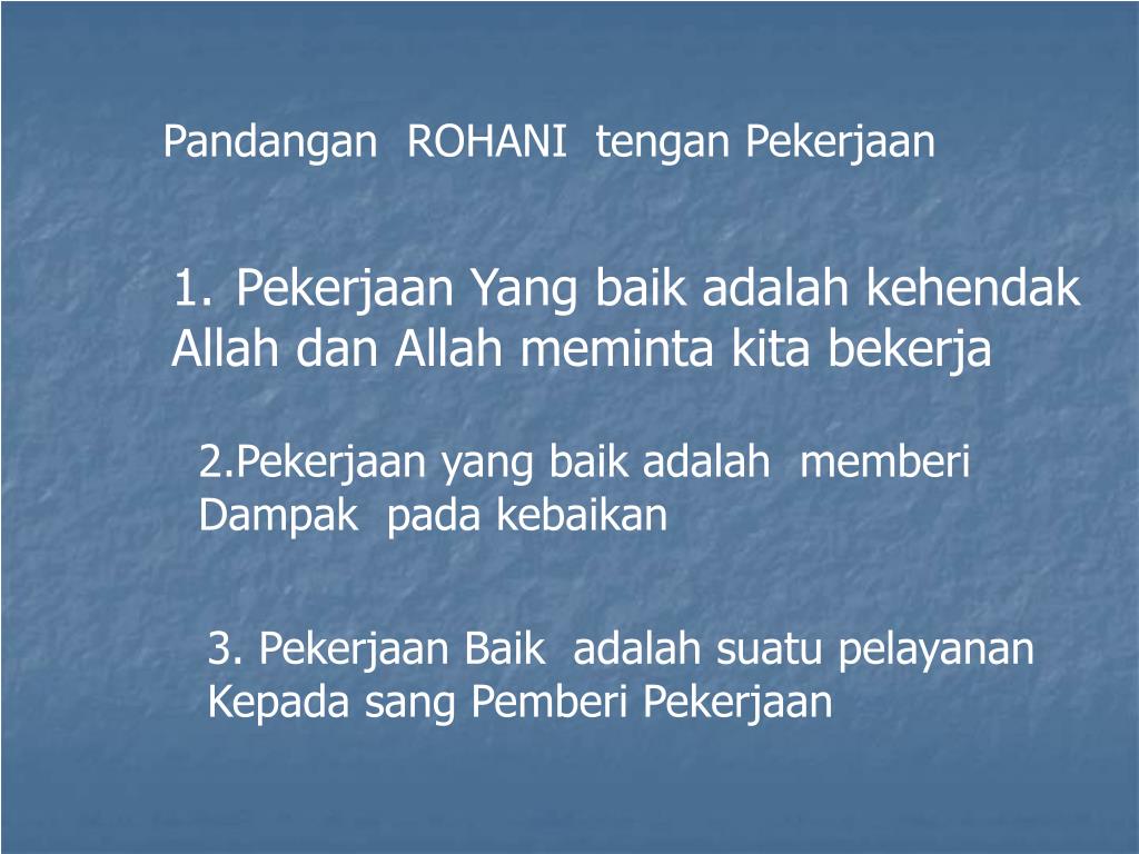 Pandangan ROHANI tengan Pekerjaan • Pekerjaan Yang baik adalah kehendak • Allah dan Allah meminta kita bekerja 2.Pekerjaan yang baik adalah memberi Dampak pada kebaikan 3. Pekerjaan Baik adalah suatu pelayanan Kepada sang Pemberi Pekerjaan