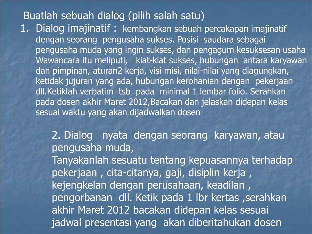 Buatlahsebuah dialog (pilihsalahsatu) • Dialog imajinatif : kembangkansebuahpercakapanimajinatifdenganseorangpengusahasukses. Posisisaudarasebagaipengusahamuda yang inginsukses, danpengagumkesuksesanusahaWawancaraitumeliputi, kiat-kiatsukses, hubunganantarakaryawandanpimpinan, aturan2 kerja, visimisi, nilai-nilai yang diagungkan, ketidakjujuran yang ada, hubungankerohaniandenganpekerjaandll.Ketiklah verbatim tsbpada minimal 1 lembar folio. SerahkanpadadosenakhirMaret 2012,Bacakan danjelaskandidepankelassesuaiwaktu yang akandijadwalkandosen 2. Dialog nyata dengan seorang karyawan, atau pengusaha muda, Tanyakanlah sesuatu tentang kepuasannya terhadap pekerjaan , cita-citanya, gaji, disiplin kerja , kejengkelan dengan perusahaan, keadilan , pengorbanan dll. Ketik pada 1 lbr kertas ,serahkan akhir Maret 2012 bacakan didepan kelas sesuai jadwal presentasi yang akan diberitahukan dosen