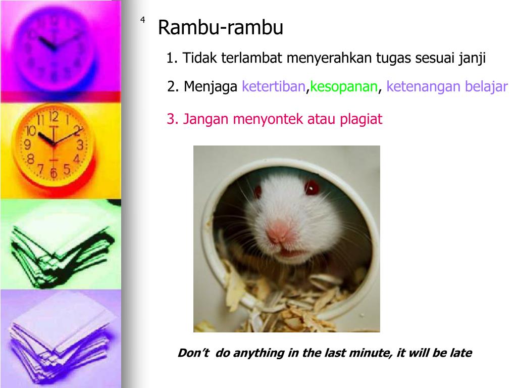 Rambu-rambu 4 1. Tidak terlambat menyerahkan tugas sesuai janji 2. Menjaga ketertiban,kesopanan, ketenangan belajar 3. Jangan menyontek atau plagiat Don’t do anything in the last minute, it will be late