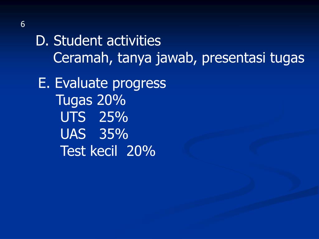 6 D. Student activities Ceramah, tanya jawab, presentasi tugas E. Evaluate progress Tugas 20% UTS 25% UAS 35% Test kecil 20%