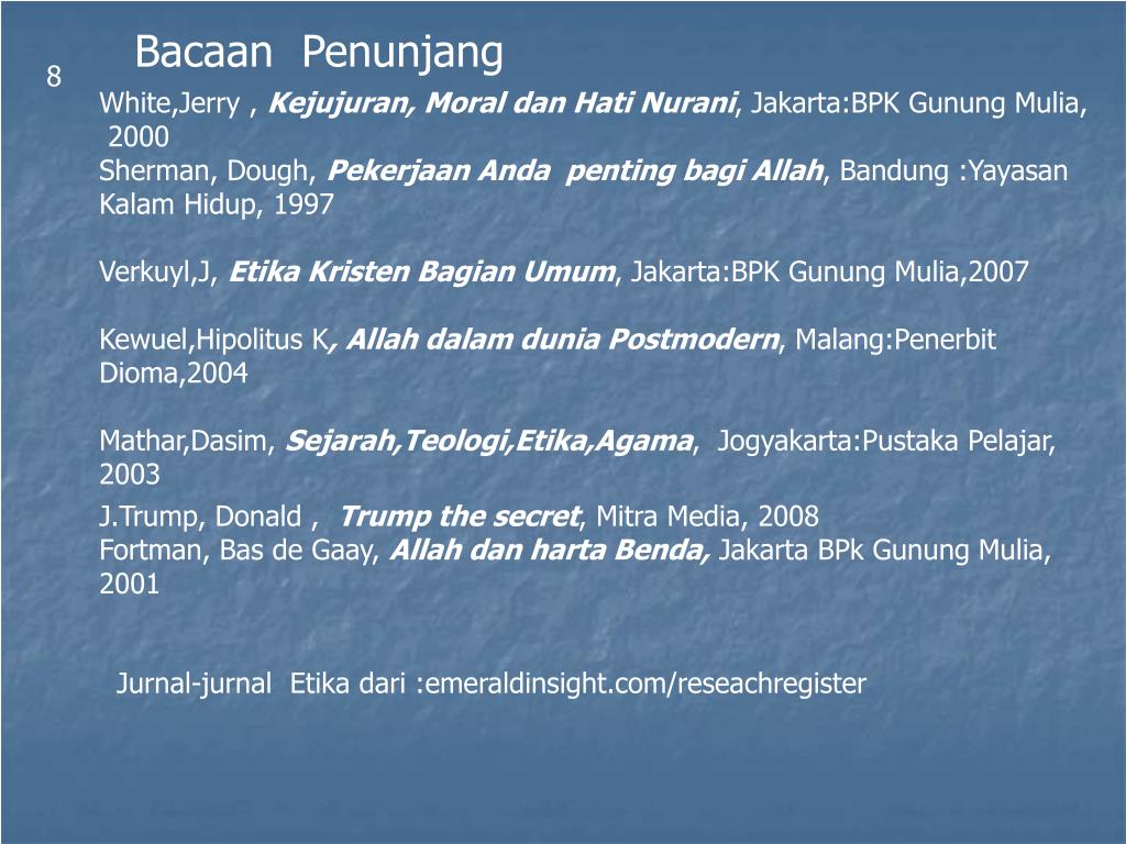 Bacaan Penunjang 8 White,Jerry , Kejujuran, Moral dan Hati Nurani, Jakarta:BPK Gunung Mulia, 2000 Sherman, Dough, Pekerjaan Anda penting bagi Allah, Bandung :Yayasan Kalam Hidup, 1997 Verkuyl,J, Etika Kristen Bagian Umum, Jakarta:BPK Gunung Mulia,2007 Kewuel,Hipolitus K, Allah dalam dunia Postmodern, Malang:Penerbit Dioma,2004 Mathar,Dasim, Sejarah,Teologi,Etika,Agama, Jogyakarta:Pustaka Pelajar, 2003 J.Trump, Donald , Trump the secret, Mitra Media, 2008 Fortman, Bas de Gaay, Allah dan harta Benda, Jakarta BPk Gunung Mulia, 2001 Jurnal-jurnal Etika dari :emeraldinsight.com/reseachregister