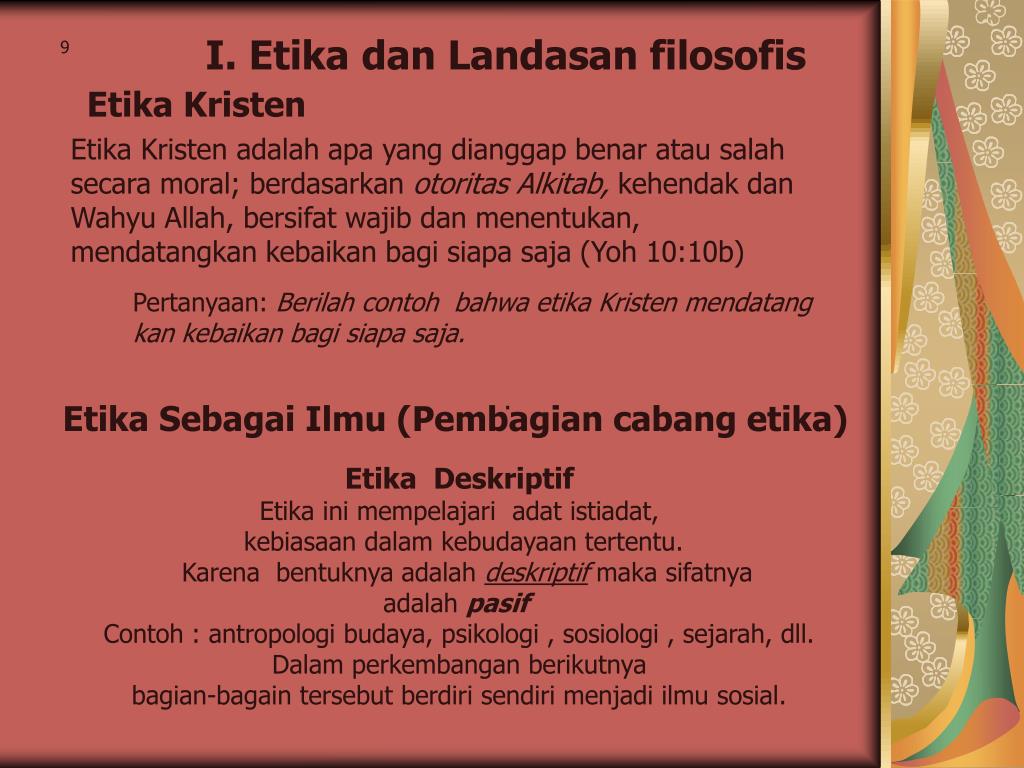 I. Etika dan Landasan filosofis 9 Etika Kristen Etika Kristen adalah apa yang dianggap benar atau salah secara moral; berdasarkan otoritas Alkitab, kehendak dan Wahyu Allah, bersifat wajib dan menentukan, mendatangkan kebaikan bagi siapa saja (Yoh 10:10b) Pertanyaan: Berilah contoh bahwa etika Kristen mendatang kan kebaikan bagi siapa saja. . Etika Sebagai Ilmu (Pembagian cabang etika) Etika Deskriptif Etika ini mempelajari adat istiadat, kebiasaan dalam kebudayaan tertentu. Karena bentuknya adalah deskriptif maka sifatnya adalah pasif Contoh : antropologi budaya, psikologi , sosiologi , sejarah, dll. Dalam perkembangan berikutnya bagian-bagain tersebut berdiri sendiri menjadi ilmu sosial.