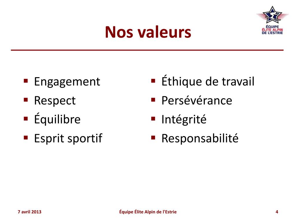 Nos valeurs • Engagement • Respect • Équilibre • Esprit sportif • Éthique de travail • Persévérance • Intégrité • Responsabilité Équipe Élite Alpin de l'Estrie