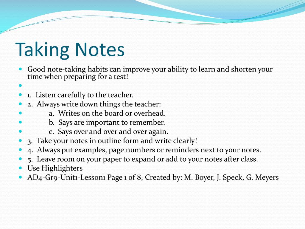 Taking Notes • Good note-taking habits can improve your ability to learn and shorten your time when preparing for a test! • 1. Listen carefully to the teacher. • 2. Always write down things the teacher: • a. Writes on the board or overhead. • b. Says are important to remember. • c. Says over and over and over again. • 3. Take your notes in outline form and write clearly! • 4. Always put examples, page numbers or reminders next to your notes. • 5. Leave room on your paper to expand or add to your notes after class. • Use Highlighters • AD4-Gr9-Unit1-Lesson1 Page 1 of 8, Created by: M. Boyer, J. Speck, G. Meyers