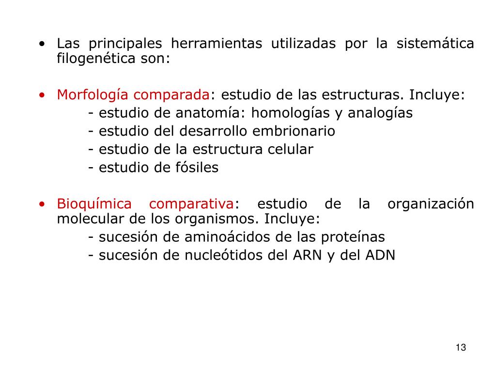 Las principales herramientas utilizadas por la sistemática filogenética son: • Morfología comparada: estudio de las estructuras. Incluye: - estudio de anatomía: homologías y analogías - estudio del desarrollo embrionario - estudio de la estructura celular - estudio de fósiles • Bioquímica comparativa: estudio de la organización molecular de los organismos. Incluye: - sucesión de aminoácidos de las proteínas - sucesión de nucleótidos del ARN y del ADN