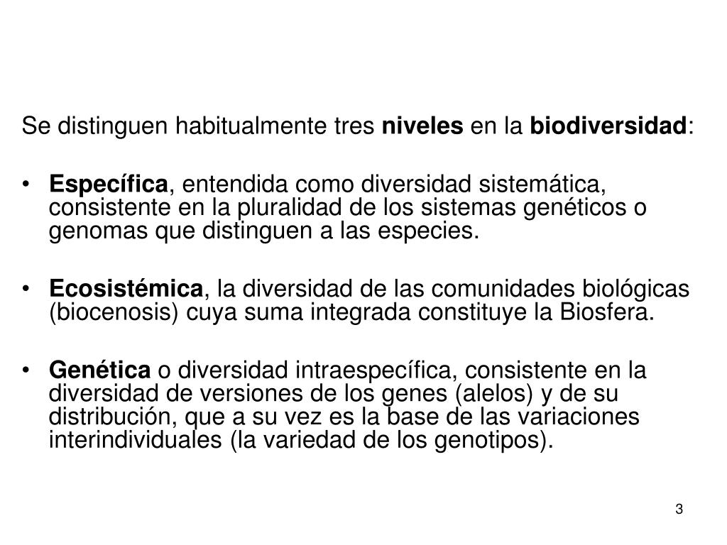 Se distinguen habitualmente tres niveles en la biodiversidad: • Específica, entendida como diversidad sistemática, consistente en la pluralidad de los sistemas genéticos o genomas que distinguen a las especies. • Ecosistémica, la diversidad de las comunidades biológicas (biocenosis) cuya suma integrada constituye la Biosfera. • Genética o diversidad intraespecífica, consistente en la diversidad de versiones de los genes (alelos) y de su distribución, que a su vez es la base de las variaciones interindividuales (la variedad de los genotipos).