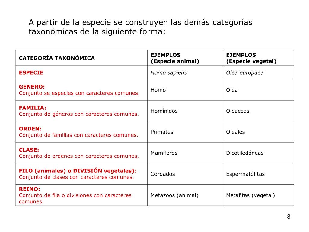 A partir de la especie se construyen las demás categorías taxonómicas de la siguiente forma:
