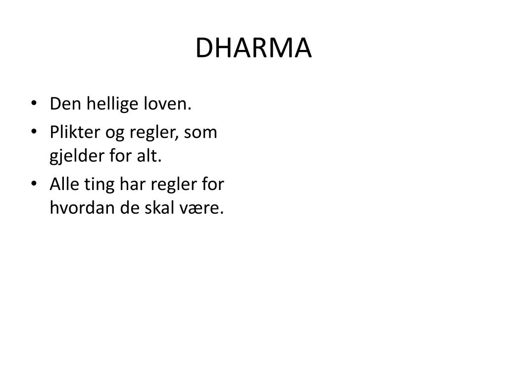 DHARMA • Den hellige loven. • Plikter og regler, som gjelder for alt. • Alle ting har regler for hvordan de skal være.