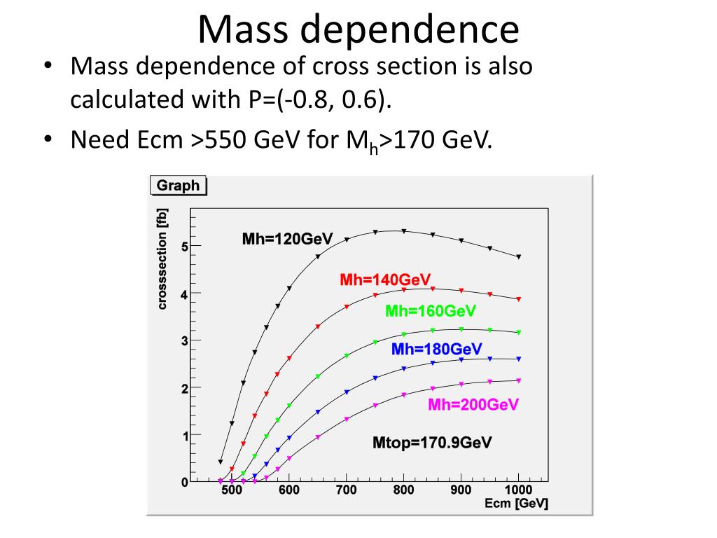Mass dependence • Mass dependence of cross section is also calculated with P=(-0.8, 0.6). • Need Ecm >550 GeV for Mh>170 GeV.