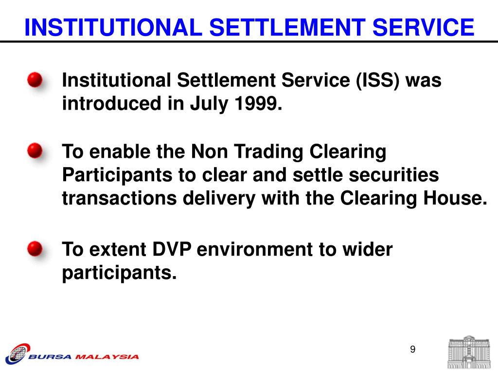 Institutional Settlement Service (ISS) was introduced in July 1999. To enable the Non Trading Clearing Participants to clear and settle securities transactions delivery with the Clearing House. To extent DVP environment to wider participants. INSTITUTIONAL SETTLEMENT SERVICE