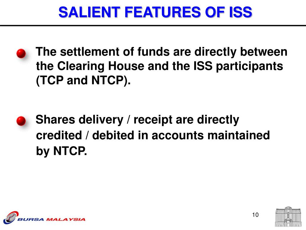 The settlement of funds are directly between the Clearing House and the ISS participants (TCP and NTCP). Shares delivery / receipt are directly credited / debited in accounts maintained by NTCP. SALIENT FEATURES OF ISS