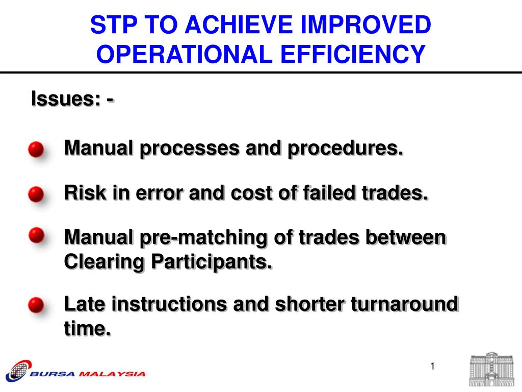 Issues: - Manual processes and procedures. Manual pre-matching of trades between Clearing Participants. Late instructions and shorter turnaround time. STP TO ACHIEVE IMPROVED OPERATIONAL EFFICIENCY Risk in error and cost of failed trades.