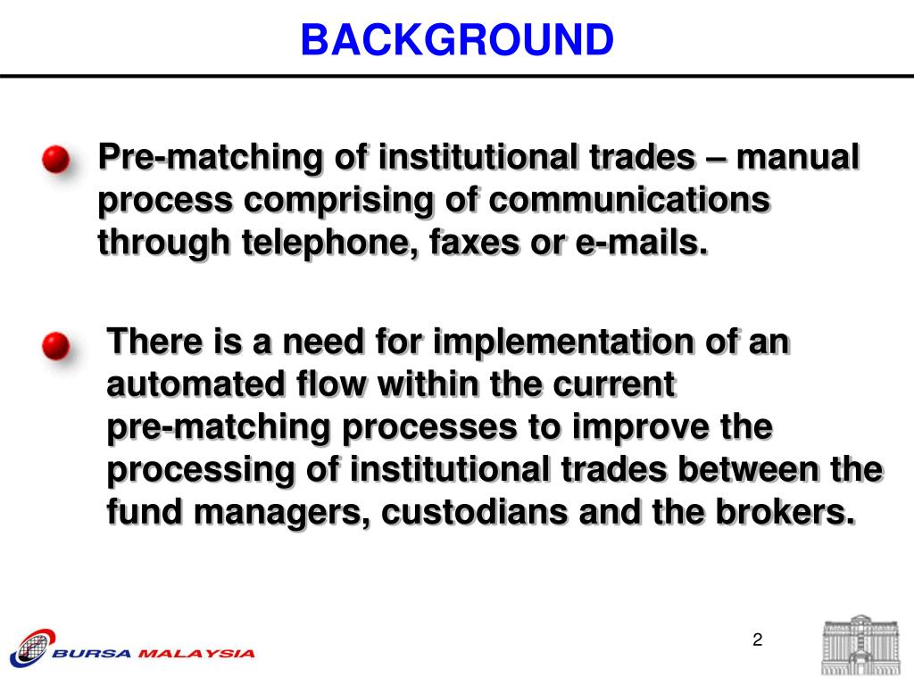 There is a need for implementation of an automated flow within the current pre-matching processes to improve the processing of institutional trades between the fund managers, custodians and the brokers. BACKGROUND Pre-matching of institutional trades – manual process comprising of communications through telephone, faxes or e-mails.