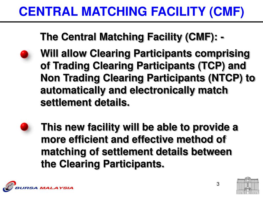 The Central Matching Facility (CMF): - Will allow Clearing Participants comprising of Trading Clearing Participants (TCP) and Non Trading Clearing Participants (NTCP) to automatically and electronically match settlement details. This new facility will be able to provide a more efficient and effective method of matching of settlement details between the Clearing Participants. CENTRAL MATCHING FACILITY (CMF)