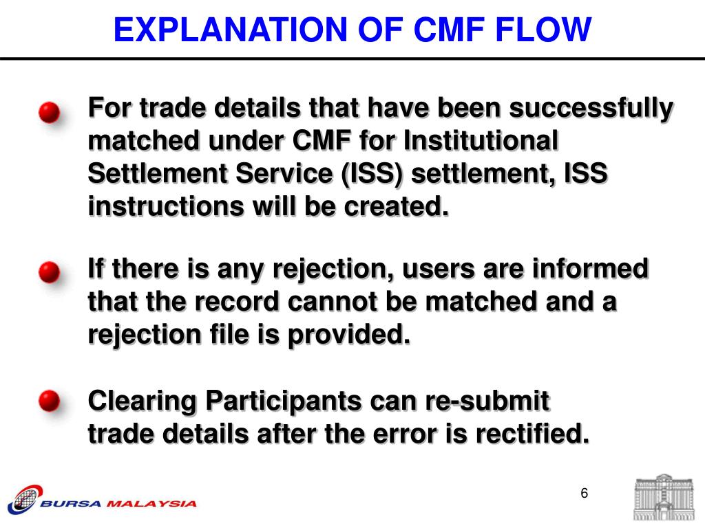 For trade details that have been successfully matched under CMF for Institutional Settlement Service (ISS) settlement, ISS instructions will be created. If there is any rejection, users are informed that the record cannot be matched and a rejection file is provided. Clearing Participants can re-submit trade details after the error is rectified. EXPLANATION OF CMF FLOW