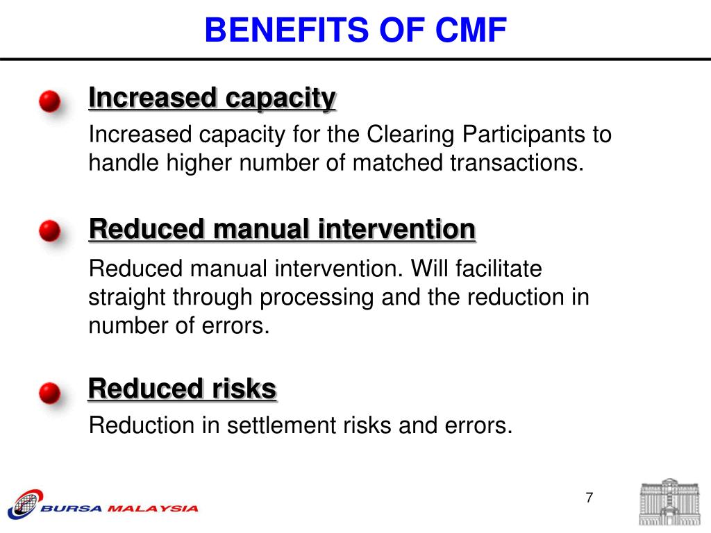 Increased capacity for the Clearing Participants to handle higher number of matched transactions. Reduced manual intervention Reduced manual intervention. Will facilitate straight through processing and the reduction in number of errors. Reduced risks BENEFITS OF CMF Increased capacity Reduction in settlement risks and errors.