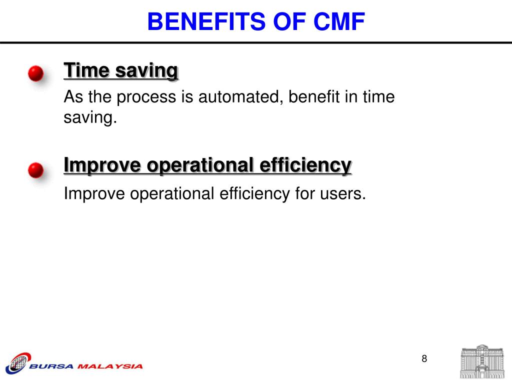 Time saving Improve operational efficiency Improve operational efficiency for users. BENEFITS OF CMF As the process is automated, benefit in time saving.