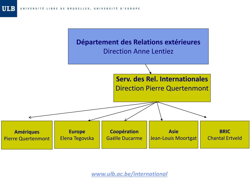 Département des Relations extérieures Direction Anne Lentiez Serv. des Rel. Internationales Direction Pierre Quertenmont Amériques Pierre Quertenmont Europe Elena Tegovska Coopération Gaëlle Ducarme Asie Jean-Louis Moortgat BRIC Chantal Ertveld www.ulb.ac.be/international