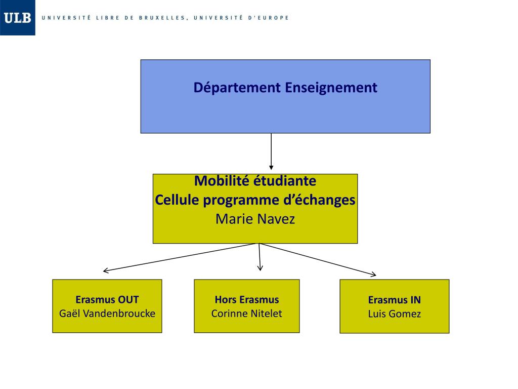 Département Enseignement Mobilité étudiante Cellule programme d’échanges Marie Navez Erasmus OUT Gaël Vandenbroucke Hors Erasmus Corinne Nitelet Erasmus IN Luis Gomez