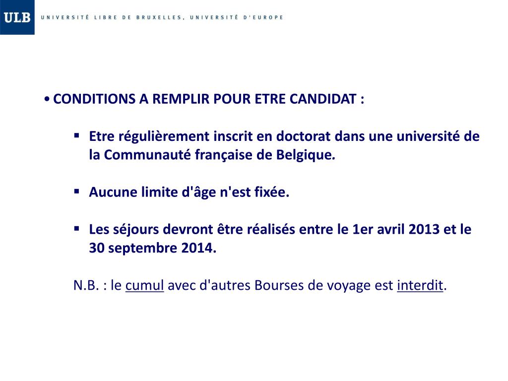 CONDITIONS A REMPLIR POUR ETRE CANDIDAT : • Etre régulièrement inscrit en doctorat dans une université de la Communauté française de Belgique. • Aucune limite d'âge n'est fixée. • Les séjours devront être réalisés entre le 1er avril 2013 et le 30 septembre 2014. • N.B. : le cumul avec d'autres Bourses de voyage est interdit.