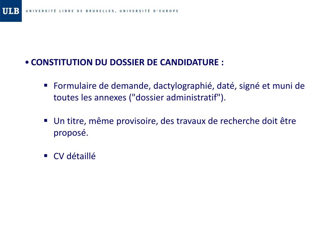 CONSTITUTION DU DOSSIER DE CANDIDATURE : • Formulaire de demande, dactylographié, daté, signé et muni de toutes les annexes ("dossier administratif"). • Un titre, même provisoire, des travaux de recherche doit être proposé. • CV détaillé