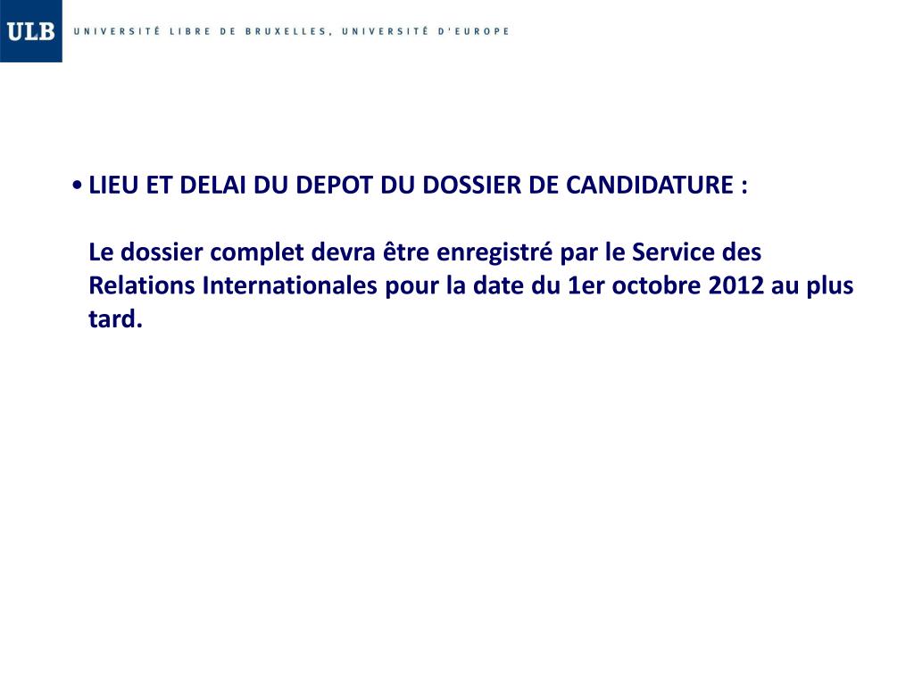 LIEU ET DELAI DU DEPOT DU DOSSIER DE CANDIDATURE : • Le dossier complet devra être enregistré par le Service des Relations Internationales pour la date du 1er octobre 2012 au plus tard.