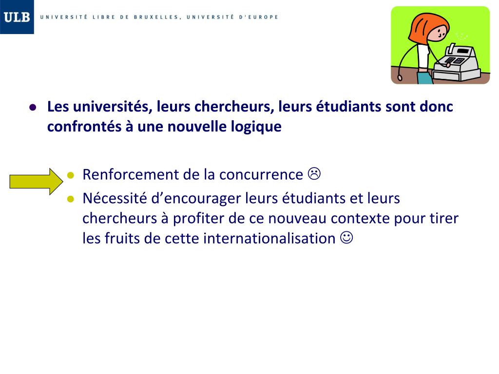 Les universités, leurs chercheurs, leurs étudiants sont donc confrontés à une nouvelle logique • Renforcement de la concurrence • Nécessité d’encourager leurs étudiants et leurs chercheurs à profiter de ce nouveau contexte pour tirer les fruits de cette internationalisation