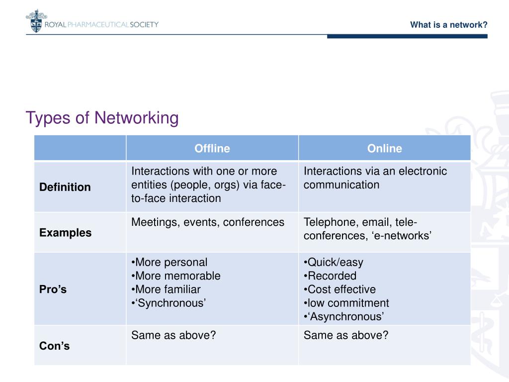 Personalise your membership Connect with fellow pharmacists Discuss topics that matter to you Share (and receive) information that will help with your career What is a network? Drivers for Networking Share Personalise Networking Connect Discuss