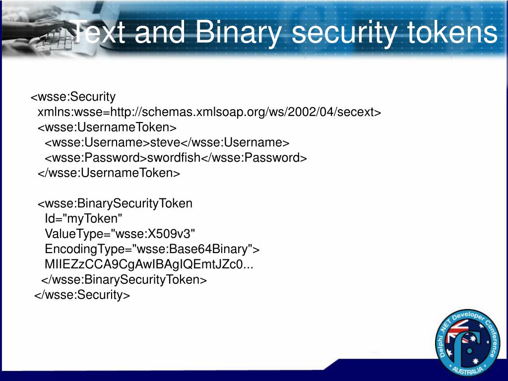 Text and Binary security tokens <wsse:Security xmlns:wsse=http://schemas.xmlsoap.org/ws/2002/04/secext> <wsse:UsernameToken> <wsse:Username>steve</wsse:Username> <wsse:Password>swordfish</wsse:Password> </wsse:UsernameToken> <wsse:BinarySecurityToken Id="myToken" ValueType="wsse:X509v3" EncodingType="wsse:Base64Binary"> MIIEZzCCA9CgAwIBAgIQEmtJZc0... </wsse:BinarySecurityToken> </wsse:Security>