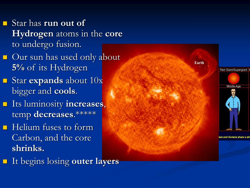 Star has run out of Hydrogen atoms in the core to undergo fusion. Our sun has used only about 5% of its Hydrogen Star expands about 10x bigger and cools. Its luminosity increases, temp decreases.***** Helium fuses to form Carbon, and the core shrinks. It begins losing outer layers