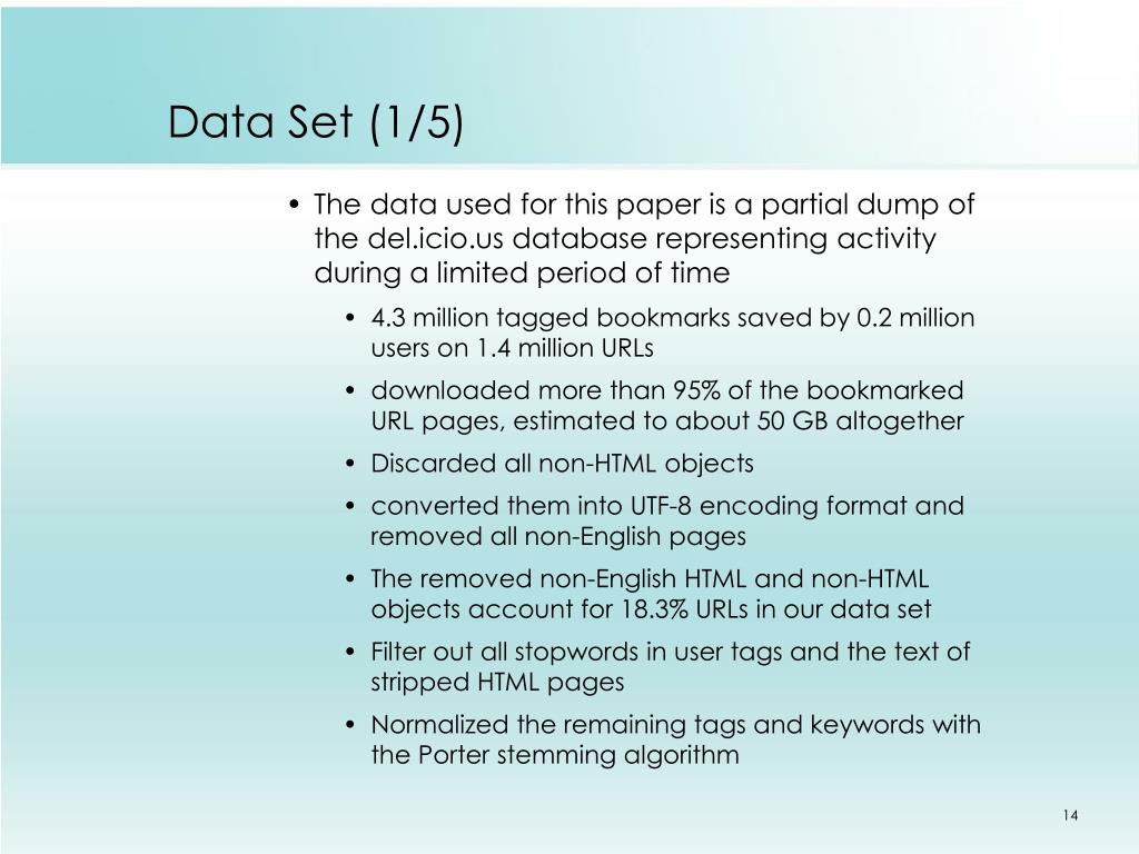 Data Set (1/5) • The data used for this paper is a partial dump of the del.icio.us database representing activity during a limited period of time • 4.3 million tagged bookmarks saved by 0.2 million users on 1.4 million URLs • downloaded more than 95% of the bookmarked URL pages, estimated to about 50 GB altogether • Discarded all non-HTML objects • converted them into UTF-8 encoding format and removed all non-English pages • The removed non-English HTML and non-HTML objects account for 18.3% URLs in our data set • Filter out all stopwords in user tags and the text of stripped HTML pages • Normalized the remaining tags and keywords with the Porter stemming algorithm