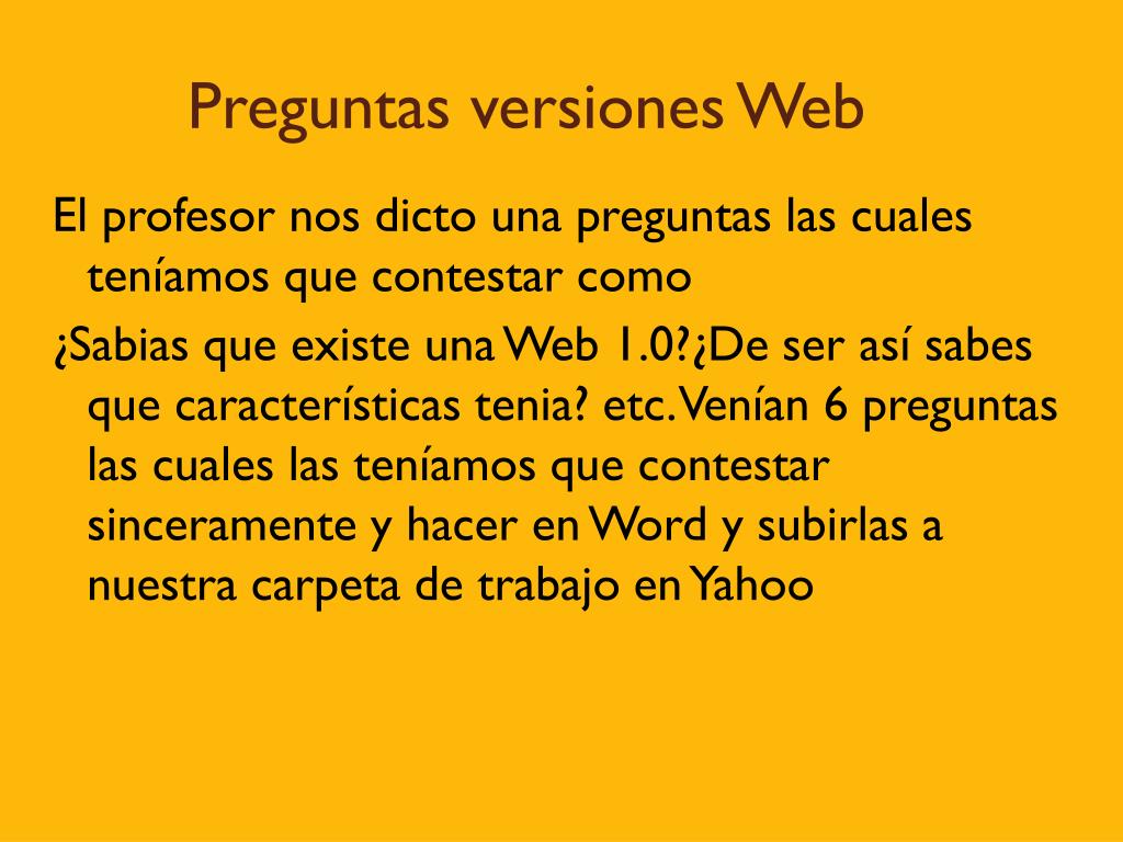 Preguntas versiones Web El profesor nos dicto una preguntas las cuales teníamos que contestar como ¿Sabias que existe una Web 1.0?¿De ser así sabes que características tenia? etc. Venían 6 preguntas las cuales las teníamos que contestar sinceramente y hacer en Word y subirlas a nuestra carpeta de trabajo en Yahoo