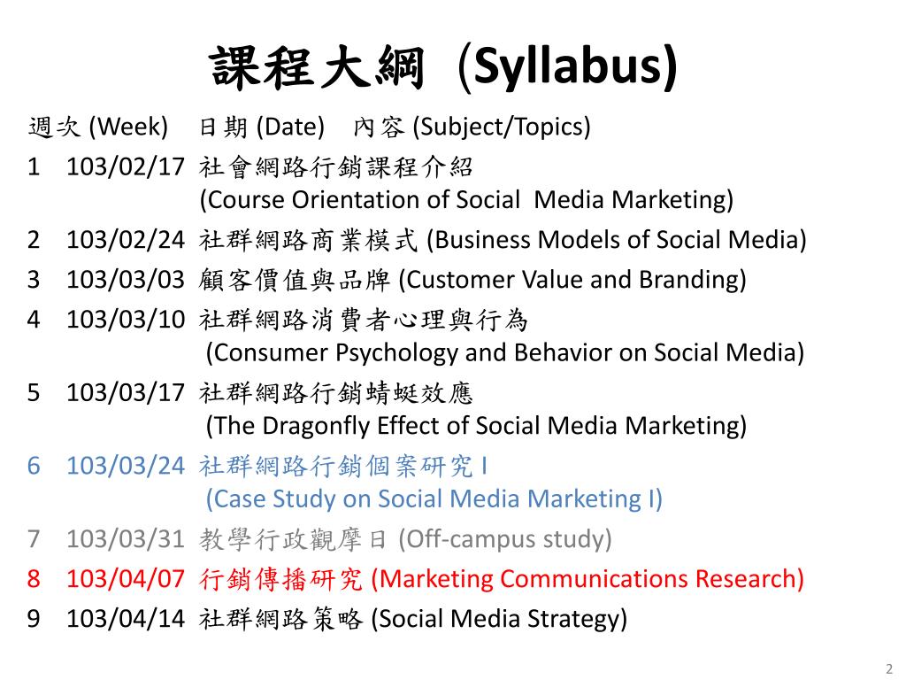 課程大綱 (Syllabus) 週次 (Week) 日期 (Date) 內容 (Subject/Topics) 1 103/02/17 社會網路行銷課程介紹 (Course Orientation of Social Media Marketing) 2 103/02/24 社群網路商業模式 (Business Models of Social Media) 3 103/03/03 顧客價值與品牌 (Customer Value and Branding) 4 103/03/10 社群網路消費者心理與行為 (Consumer Psychology and Behavior on Social Media) 5 103/03/17 社群網路行銷蜻蜓效應 (The Dragonfly Effect of Social Media Marketing) 6 103/03/24 社群網路行銷個案研究 I (Case Study on Social Media Marketing I) 7 103/03/31 教學行政觀摩日 (Off-campus study) 8 103/04/07 行銷傳播研究 (Marketing Communications Research) 9 103/04/14 社群網路策略 (Social Media Strategy)