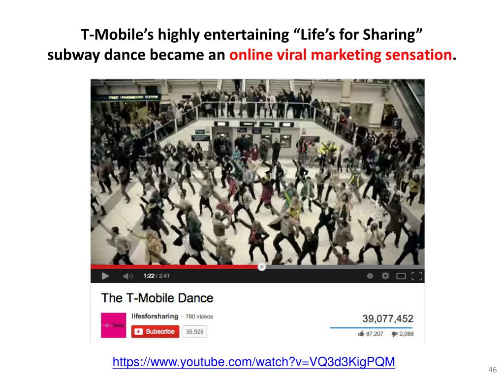 T-Mobile’s highly entertaining “Life’s for Sharing”subway dance became an online viral marketing sensation. https://www.youtube.com/watch?v=VQ3d3KigPQM